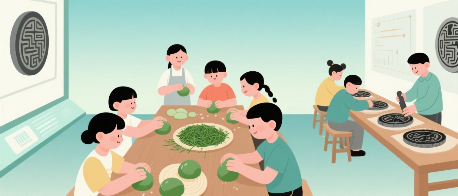 2026 年 4 月 5 日,清明假期刚过,淮北市博物馆一楼的活动室里却比往常更加热闹。长桌旁,20 多名低年级的孩子正围着揉捏绿色的面团,空气中弥漫着淡淡的艾草香——这是“春日食趣”青团制作现场。而在隔壁的“瓦当拓印”区,几位三四年级的学生正屏气凝神,手中的拓包小心翼翼地在模具上拍打,黑色的墨迹逐渐显现出古老的纹路。