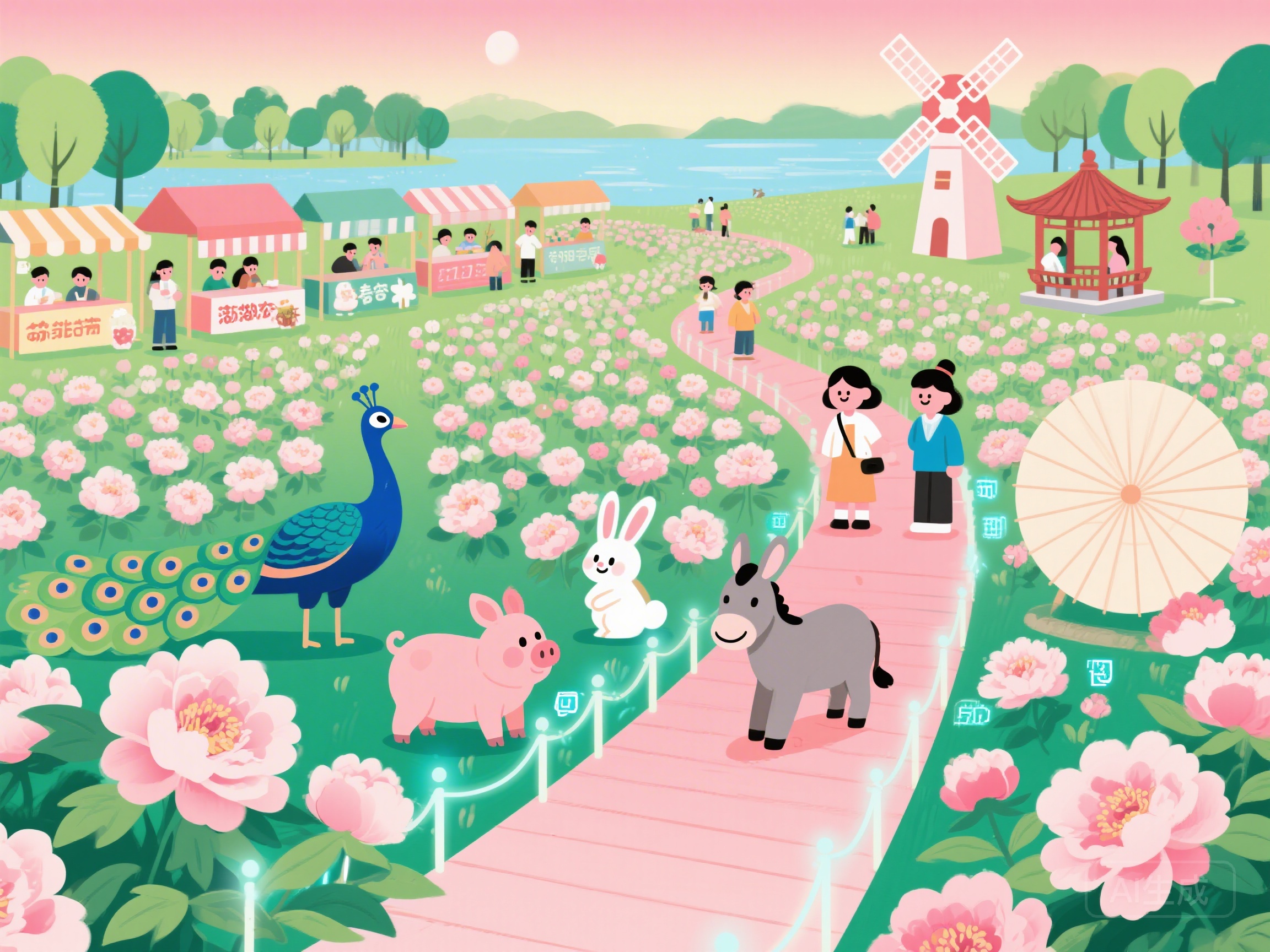 - 风车步道:彩色风车搭配两侧牡丹,风一吹,动态感拉满。