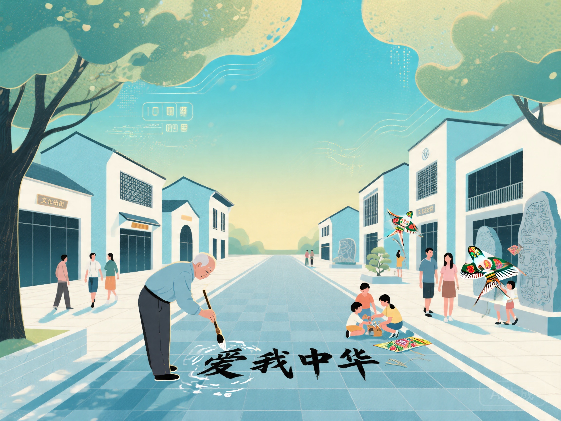 如果你在这个周末走进博物馆路,大概率会看到这样一幕:在爱园城市客厅的广场上,一位大爷正拿着大号毛笔,蘸着清水在地砖上写下“爱我中华”,笔锋遒劲,引来路人驻足;不远处的树荫下,年轻妈妈带着孩子正在体验非遗风筝手作,笑声和春风一起荡漾;再往深处走,三三两两的年轻人沿着石板路漫步,打卡汉画像石主题景观小品,没有匆匆而过的车流,只有愿意为一片风景、一个展览停下脚步的人群。